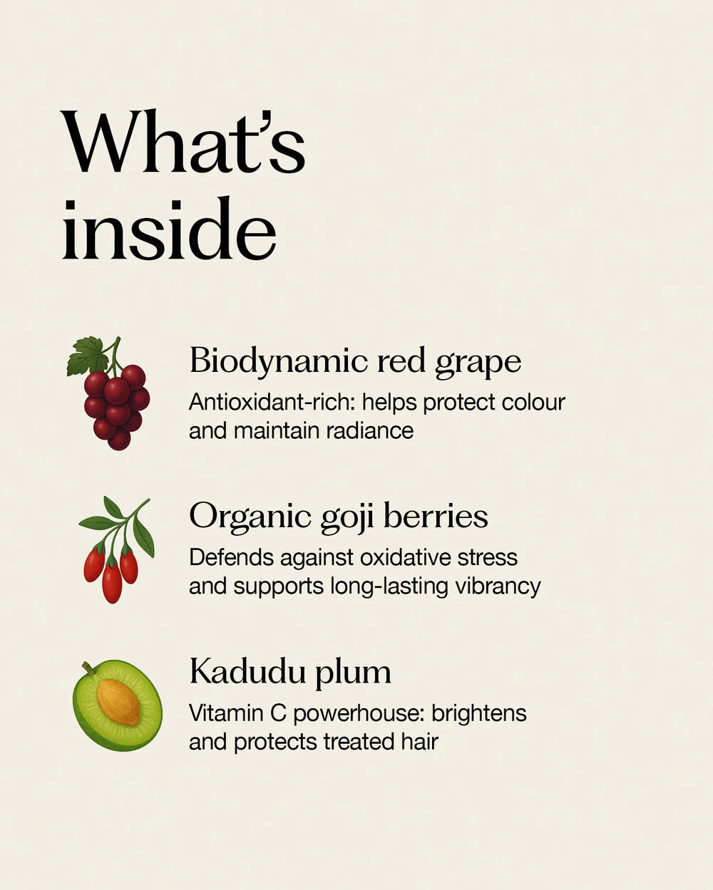 هذا الشامبو مو مجرد تنظيف، هو طقس عناية فاخرة يحافظ على حيوية اللون ولمعانه من أول غسلة. تركيبته الغنية خالية من الكبريتات، تنظّف بلطف وتحافظ على الصبغة بفضل مزيج نباتي قوي من العنب الأحمر الحيوي، توت الغوجي العضوي، والكاكادو بلوم من التجارة العادلة — ثلاثي مضاد للأكسدة يحمي الشعر من أشعة الشمس والتلوث.